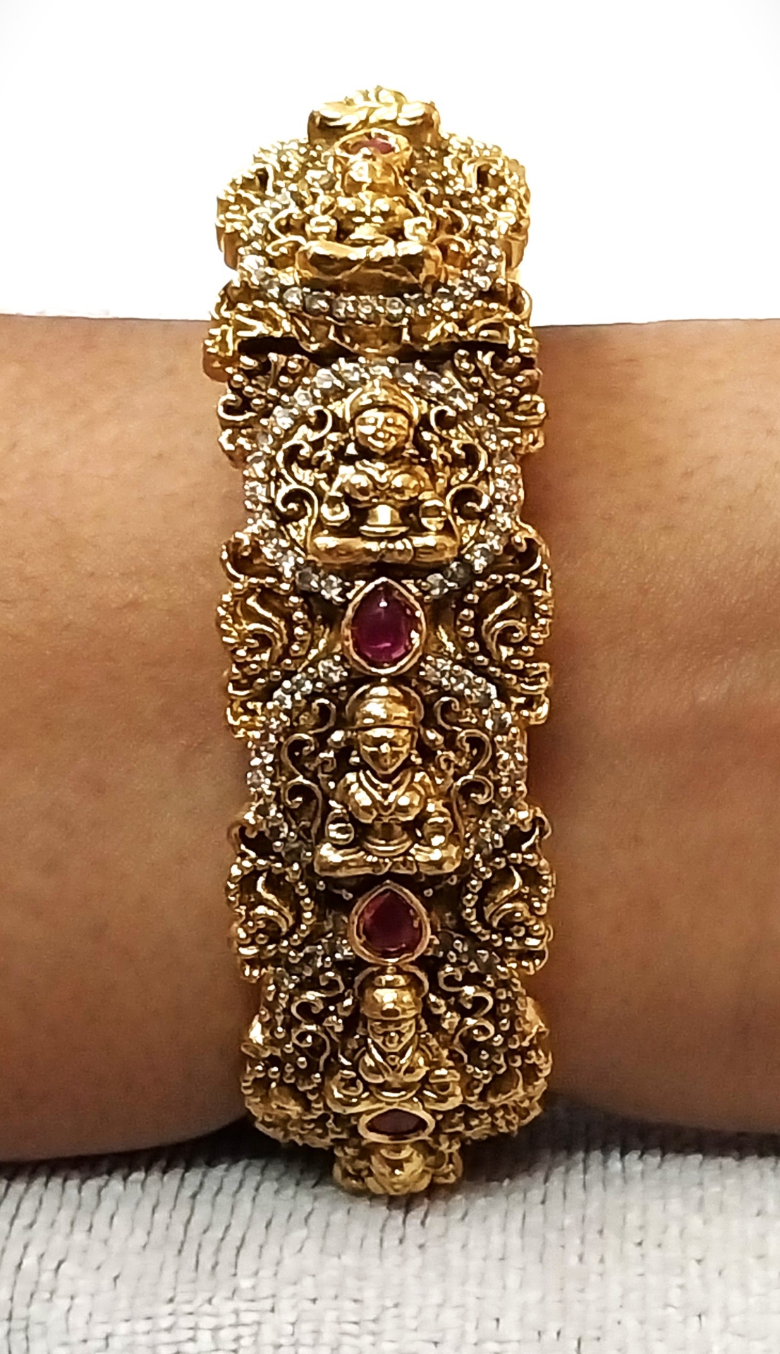 This is a bangle with detailed patterns all over its surface. There are darker spots within the design, which make the patterns stand out. It has a soft shine, and the overall look highlights its intricate craftsmanship.