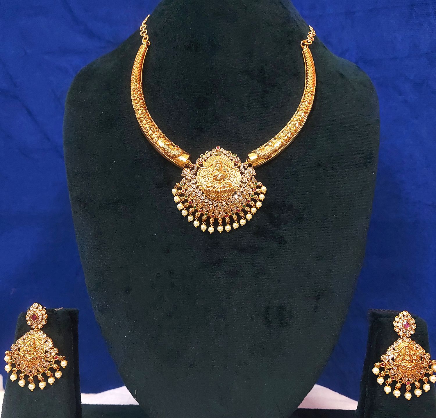 This necklace is a traditional indian jewellery,possibly it appears to be made up of gold with embellishmentsnthat could be kundan or polki work.
