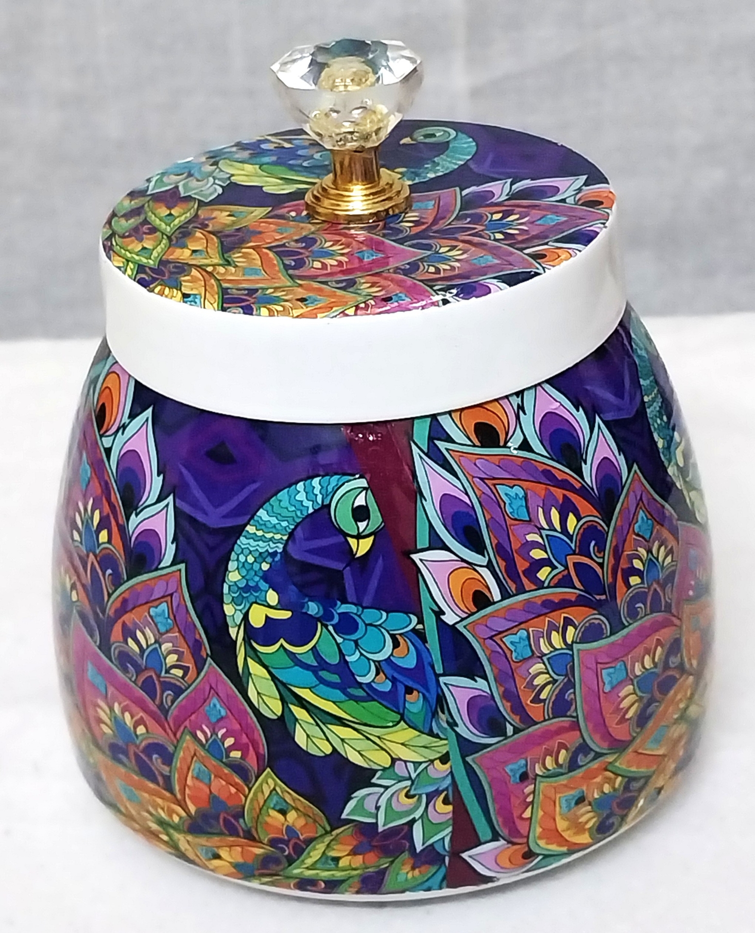 - DESIGN: Charming metal storage jar featuring a vibrant floral design with a peacock.