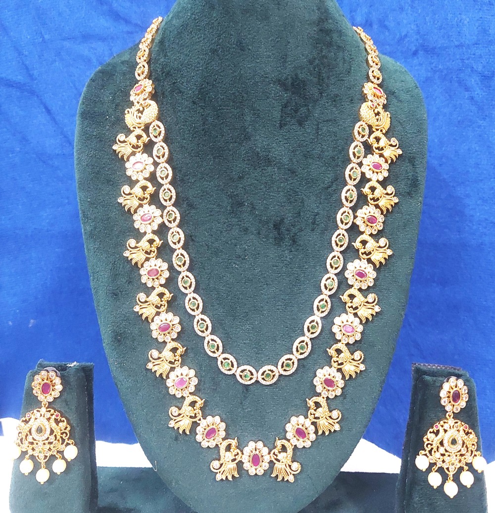 This necklace features a double-strand with intricate floral design and circular patterns and possibly enamel accents within the floral design.