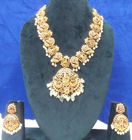 This type of haram depits the ten avatars(incarnations) of hindu god vishnu.each segment of the haram features a different avatar.the pendent of a necklace also showcases indicate design related to vishnu and his avatars.set of earrings.