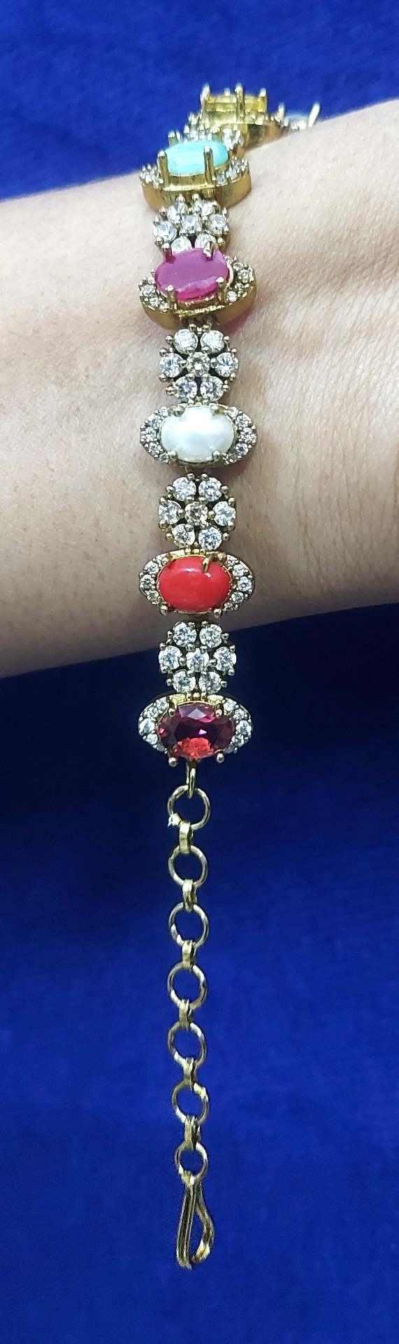 The bracelet is a gold-toned bracelet with multiple stones set in an ornate design. The stones are a mix of colors, including red, white, and pink, and are surrounded by smaller clear stones that may be cubic zirconia. The bracelet also features a chain section with interlocking circular links.