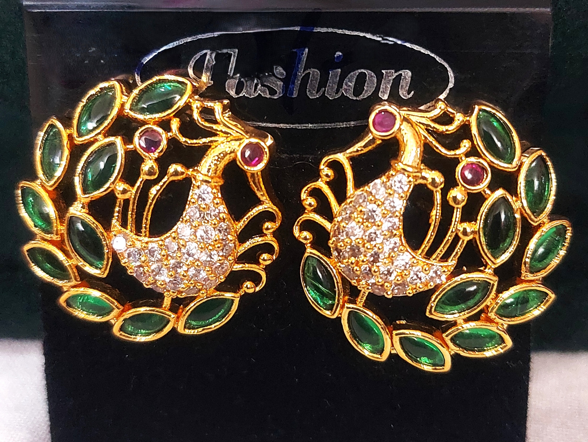 These earrings feature a peacock design, are gold plated and are adorned with CZ stones along with green stones that resemble emeralds and ruby like stone on the head of the peacock.
