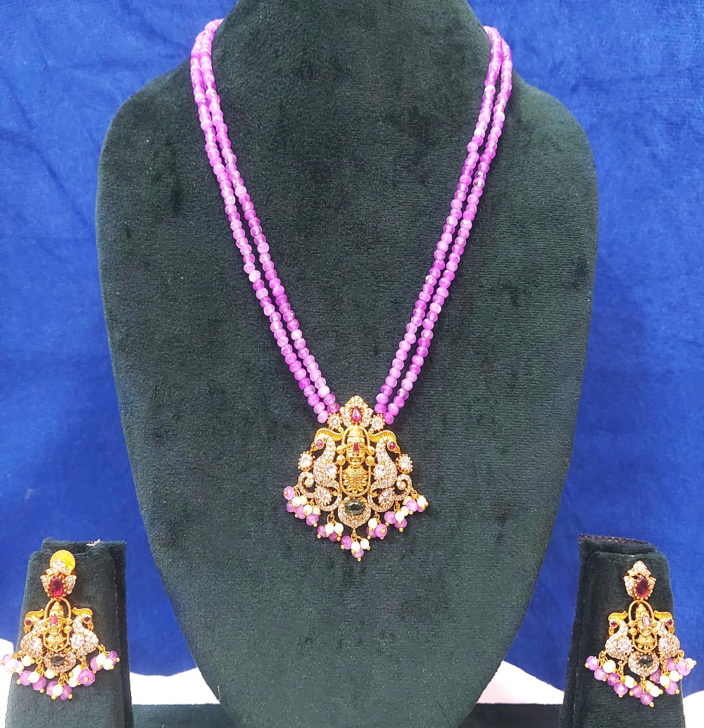 This is a pink beaded necklace with a gold pendant featuring an image of lord Venkateshwara. The pendant has intricate carvings and is adorned with small white and pink beads at the bottom and flanked by peacocks.The necklace is made of two strands of pink beads giving it an traditional look.This is having matching ear rings.