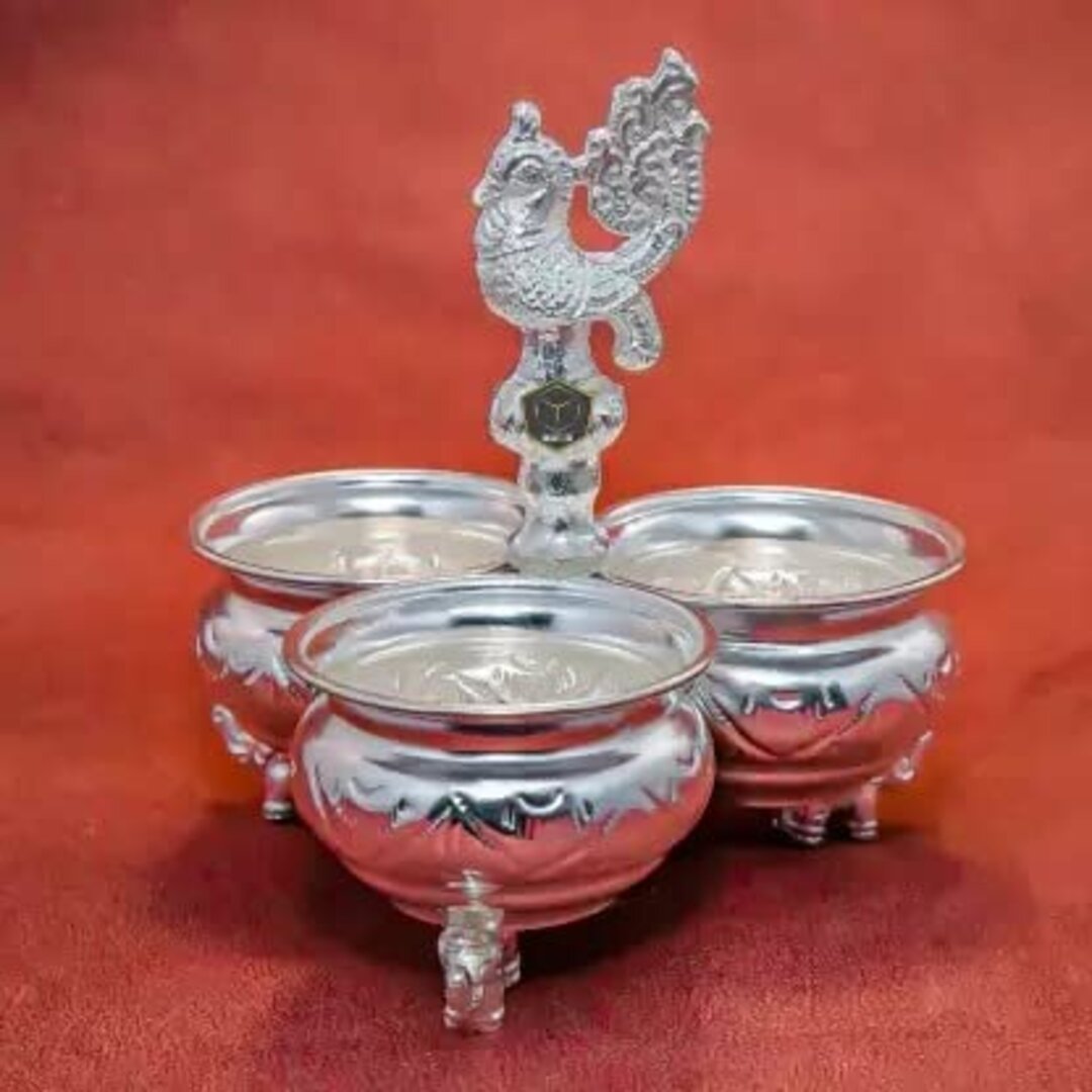 German Silver Haldi Kumkum Bharani Box with Peacock Holder / Punchwala 3 Cup for Puja and Gift Purpose